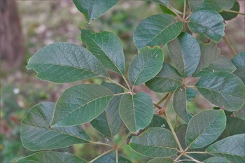 掌狀複葉,小葉4至5片,長橢圓形至倒卵形,膜質至堅紙質,葉的邊緣或具疏鋸齒。中央小葉較大,側生小葉漸小,具小葉柄,輪廓有如手掌。冬季落葉,先花後葉。 |