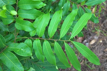 偶數羽狀複葉,小葉4至5對,稀 3或6對。小葉長圓狀橢圓形至長圓狀披針形,近對生,薄革質。小葉葉尖急尖或鈍,小葉葉基楔形、不對稱,葉緣波狀。葉面深綠色、有光澤。葉柄、小葉柄及葉軸均被星狀毛。 |